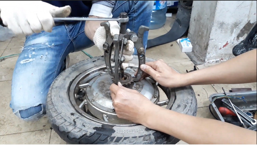 Bộ động cơ xe đạp diện này bị ngập nước một thời gian nên bị bó bánh, rỉ sét nhiều nơi bên trong lõi cũng như vành nam châm bên ngoài. Nên trang bị bao tay, kính cũng như các dụng cụ cần thiết để đảm bảo an toàn lao động. Như các bạn có thể thấy, ở đây chúng tôi sử dụng van để tháo cho dễ dàng và an toàn hơn.